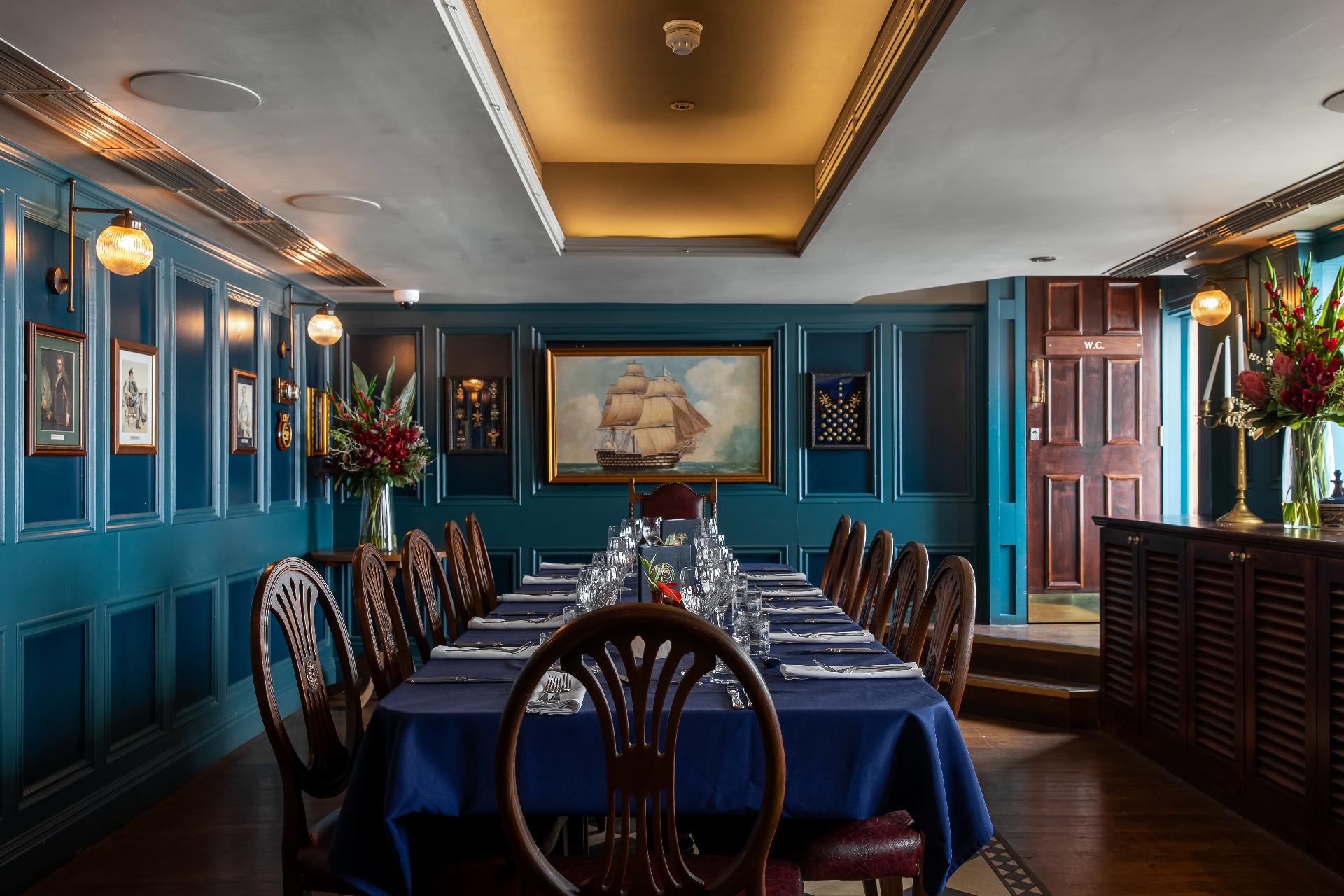 The private dining room, The Admiral’s Cabin, is the most exclusive area of the pub. The room offers seating for 14, together with full AV facilities - perfect for an exclusive dining experience or holding board meetings. This room is an opulent setting that can be adapted for private dining - the ideal place to wow your guests.